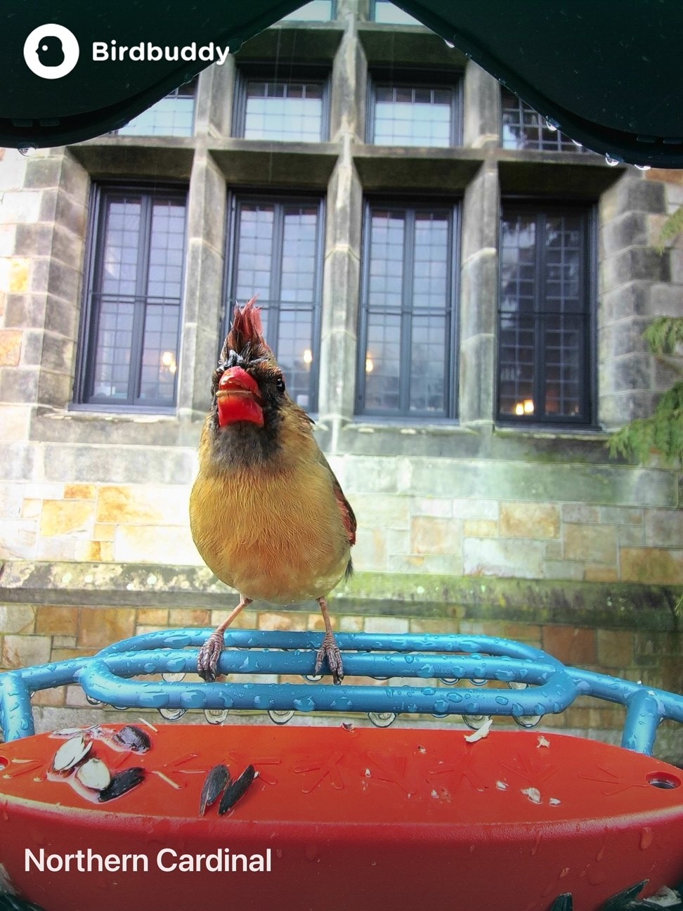 Northern Cardinal. From the Birdbuddy app: Did you know northern cardinal pairs share song phrases? In this case, it is the female whose song is longer and more complex. In wintertime, camouflage definitely isn’t their primary aim, as they keep their distinctive red plumage even in the colder months. They are well-loved, as evidenced by the fact they are the state bird of seven states! The oldest recorded northern cardinal was a female that was 15 years and 9 months old.