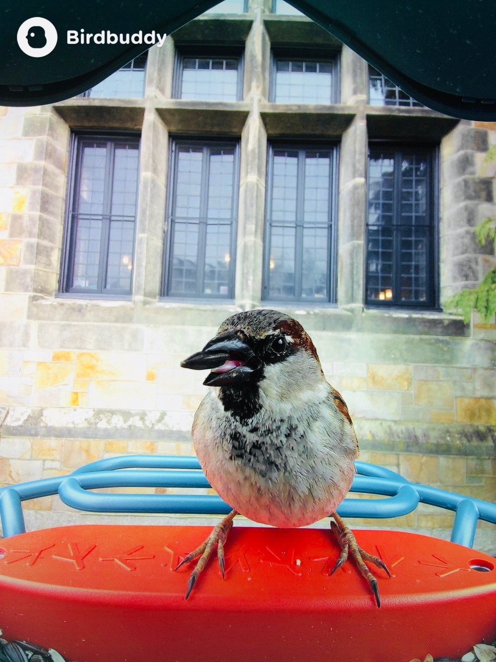 House Sparrow. From the Birdbuddy app: House sparrows have long been our companions, living alongside us since the Stone Age and are still found in places where humans live. They are social birds that roost in groups and engage in social singing, meaning multiple birds will call together from bushes, like little sparrow choir. Cleanliness is important and you will frequently see them taking dust baths.
