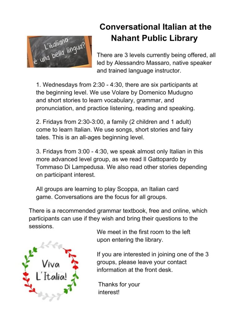 There are 3 levels currently being offered, all led by Alessandro Massaro, native speaker and trained language instructor.