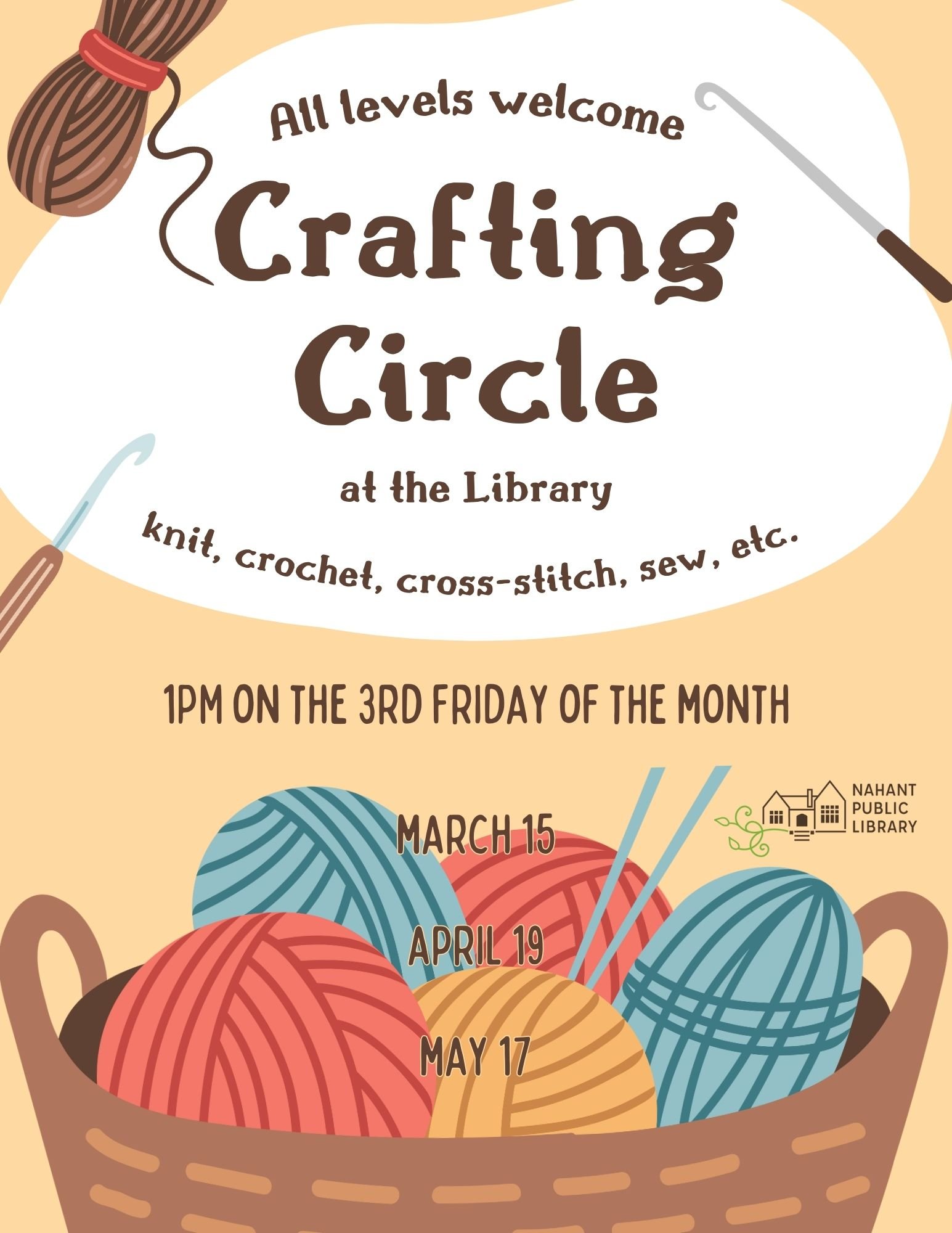 Join us on the 3rd Friday of each month at 1:00 pm for some crafting! The format is pretty flexible, so bring your craft of choice and come join us. All levels are welcome, we can help get you started in a variety of crafts.