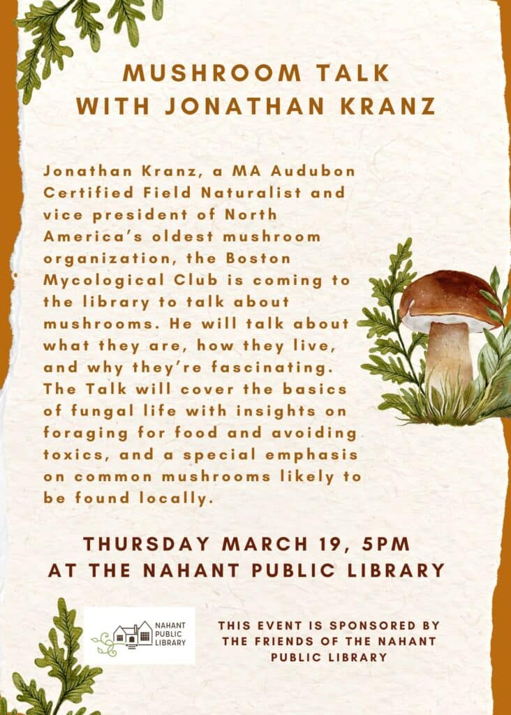 Jonathan Kranz, a MA Audubon Certified Field Naturalist and vice president of North America’s oldest mushroom organization, the Boston Mycological Club is coming to the library to talk about mushrooms. He will talk about what they are, how they live, and why they’re fascinating. The Talk will cover the basics of fungal life with insights on foraging for food and avoiding toxics, and a special emphasis on common mushrooms likely to be found locally.