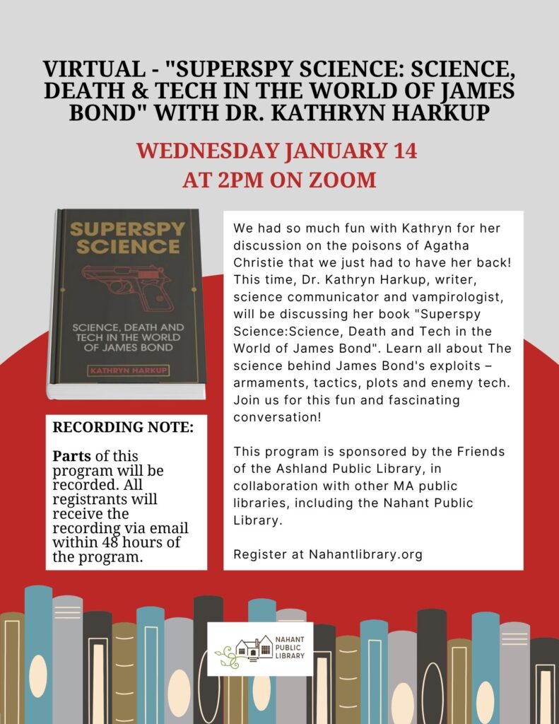 We had so much fun with Kathryn for her discussion on the poisons of Agatha Christie that we just had to have her back! This time, Dr. Kathryn Harkup, writer, science communicator and vampirologist, will be discussing her book “Superspy Science:Science, Death and Tech in the World of James Bond”. Learn all about The science behind James Bond’s exploits – armaments, tactics, plots and enemy tech. Join us for this fun and fascinating conversation!